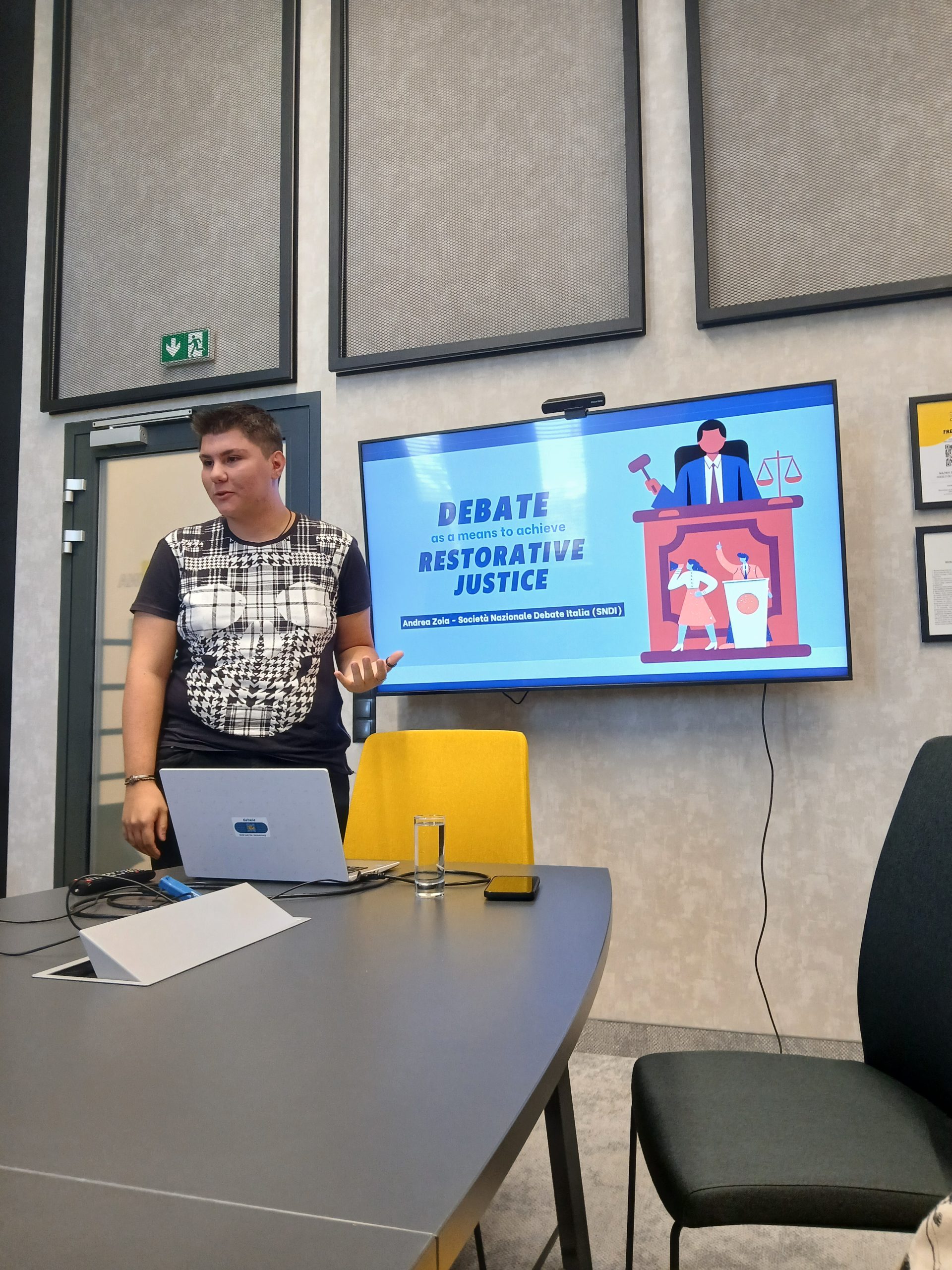 - il socio Junior Andrea Zoia, neo-diplomato e membro uscente della Nazionle U19 ha dimostrato ancora una volta come il futuro del Debate (anche italiano) sia in ottime mani, presentando un workshop su Debate e giustizia riparativa. Obiettivo cercare di rispondere alle domande: quale è il legame fra i due? E come potremmo sfruttare le attività di dibattito per migliorare la giustizia riparativa in Italia ed in Europa?